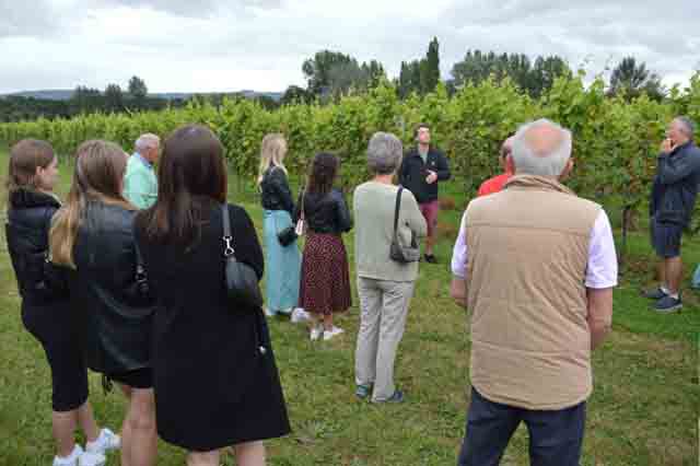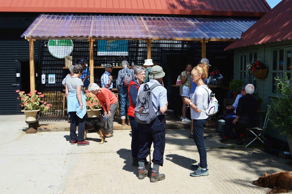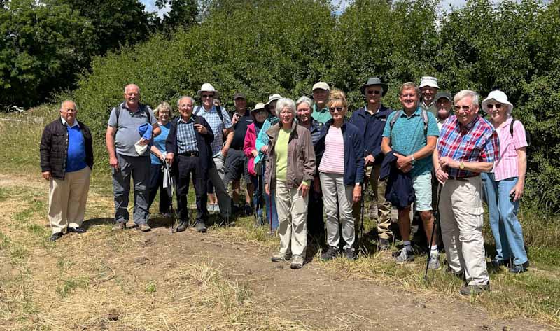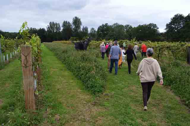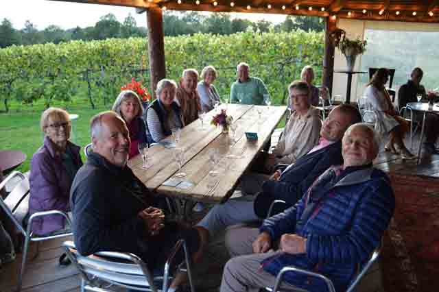 The weather, after a wet and windy week, provided a charming English Summer’s Day to allow 15 members and guests to depart from the Queens Head in West Chiltington for about a 4 mile walk. The first half took the group past St Mary’s Church, the windmill, recreation ground, a number of stiles and meadows before arriving at the Nutbourne Vineyard. There, we were given a short history about the vineyard and wine growing process by Bridget Gladwin, one of the owners. After some recreational wine tasting the party continued leisurely through the Nutbourne and Nyetimber vineyards to arrive back at the Queens Head. Sadly, we were unable to participate in lunch at the pub because it was forced to close due to the staff having to covid isolate (sprung on them at 8.45am that morning).