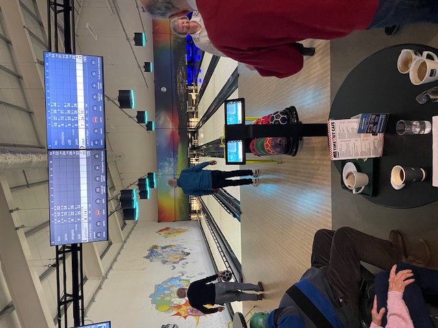 The annual Ten Pin Bowling challenge between Chanctonbury and Storrington Probus clubs was held today Monday 5th February 2024 at the Out of Bounds Bowling alley in Rustington. Three teams from each club competed for the new challenge trophy "Lucky Strikes". There were 5 bowlers per lane and everyone had 2 games each of 10 frames. A closely contested match with Chanctonbury's Lane 1 team having the highest overall bowling score. The winning team were Tim and Jane Hulbert, Angela Jones, Laki Marangos and Graham Moss (virtual presence). The winning score was 935 with the Storrington team of Clive Boland, John Brocklebank, Ken Collins, Peter and Vanessa Edwards a close second with a score of 921.
