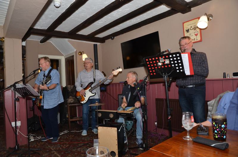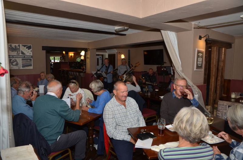 We were fortunate to avoid the rain and adjourned to the nearby Crown Inn for an excellent lunch and listen to the local group Feelin’ Lucky who entertained us with songs and music from our era whilst the rain came down outside!