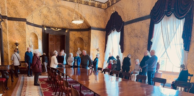 37 Members and associates visited Windsor castle, the largest and oldest occupied castle in the world. The coach picked us up at 9.00 and we were in Windsor before 11.00 having heard all about the castle and where we were travelling through from our excellent and informative guide Frances. After coffee and cake we wound our way up through the sunshine and crowds into the castle visiting the State Apartments, St George's Chapel and Queen Mary's Dolls House. The Chapel contained the tomb of our much loved and recently departed Queen Elizabeth II and the guides explained how the actual TV burial and later real life family interment had taken place.