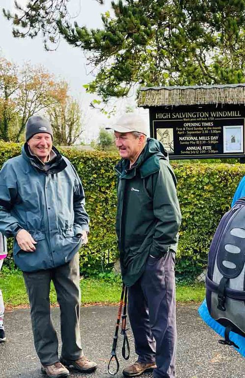 START: Walked along the top of the Gallops recreation ground to the zig zag Bridlepath which is a steepish short climb up a tarmac path with handrails to join the end of Furze Road near High Salvington Windmill. A pause to view the Mill and grounds before continuing a few hundred yards to the lower end of Honeysuckle Lane, which continued onto the downs, eventually we would have had fabulous views seaward of the Rampion Windfarm and westward toward the Solent and Isle of Wight. However misty conditions prevented this. We continued onto a track along the top of Long Furlong. Here our only stile then downhill along a track by Findon Cricket Ground to The Church of St John the Baptist dating from the 11th Century. A short walk down the lane past Findon Place then along a track passing Rogers Farmhouse, Stables and eventually returning to the Car Park.