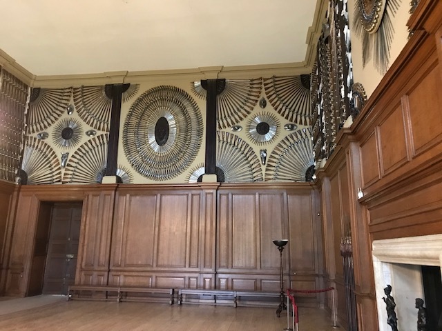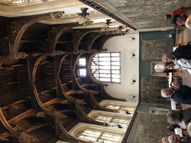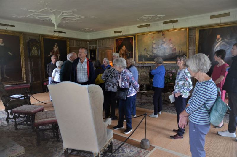 Although many of us had visited the house before, probably on more than one occasion, Carol’s encyclopaedic knowledge and obvious love of the house, its history and all the many artefacts contained in it made it come alive in a way that is not normally possible. We started our tour in the Great Hall with many paintings of the Palmer and Bishopp families who had owned the property and were intrigued by the large heavy leather water jug on display on the central table which was on casters for ease of use. The tour finished in the extraordinary long gallery, the third longest of its kind in the country, where the far sited architect had provided a panelled ceiling so that if the roof leaked and damaged the ceiling only the damaged part of it would need to be renewed.