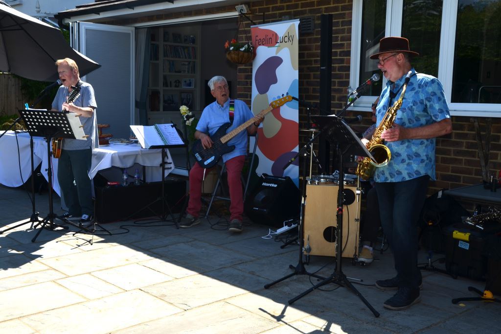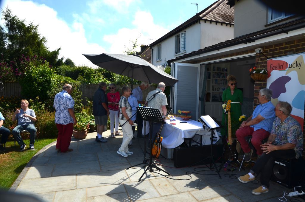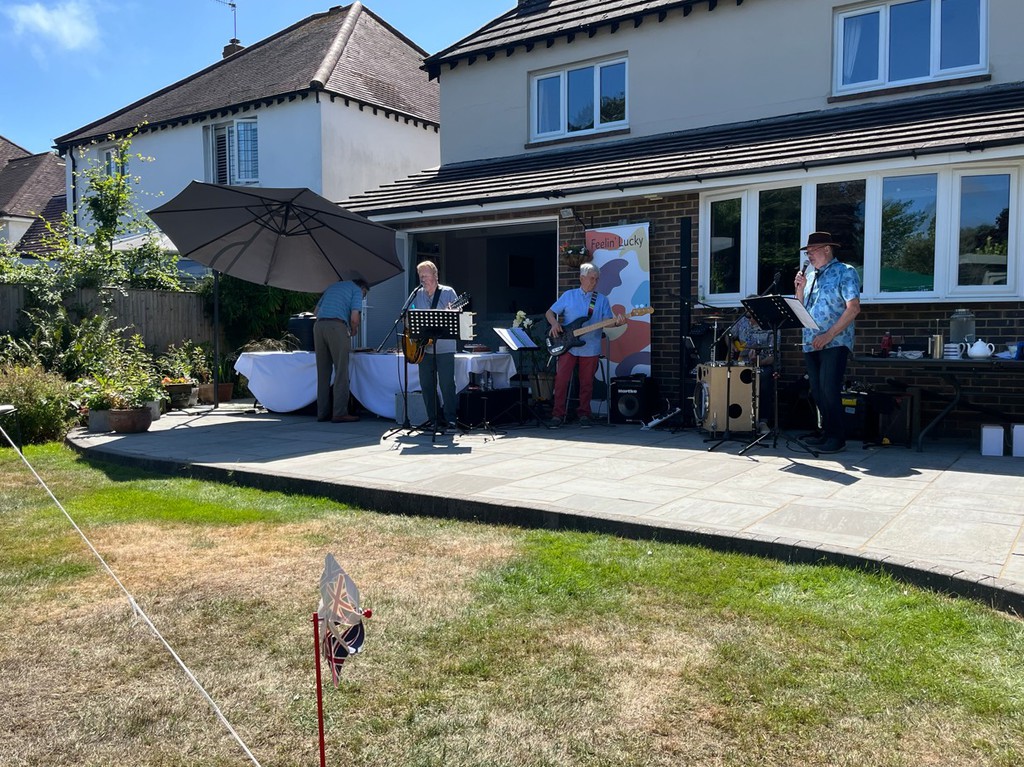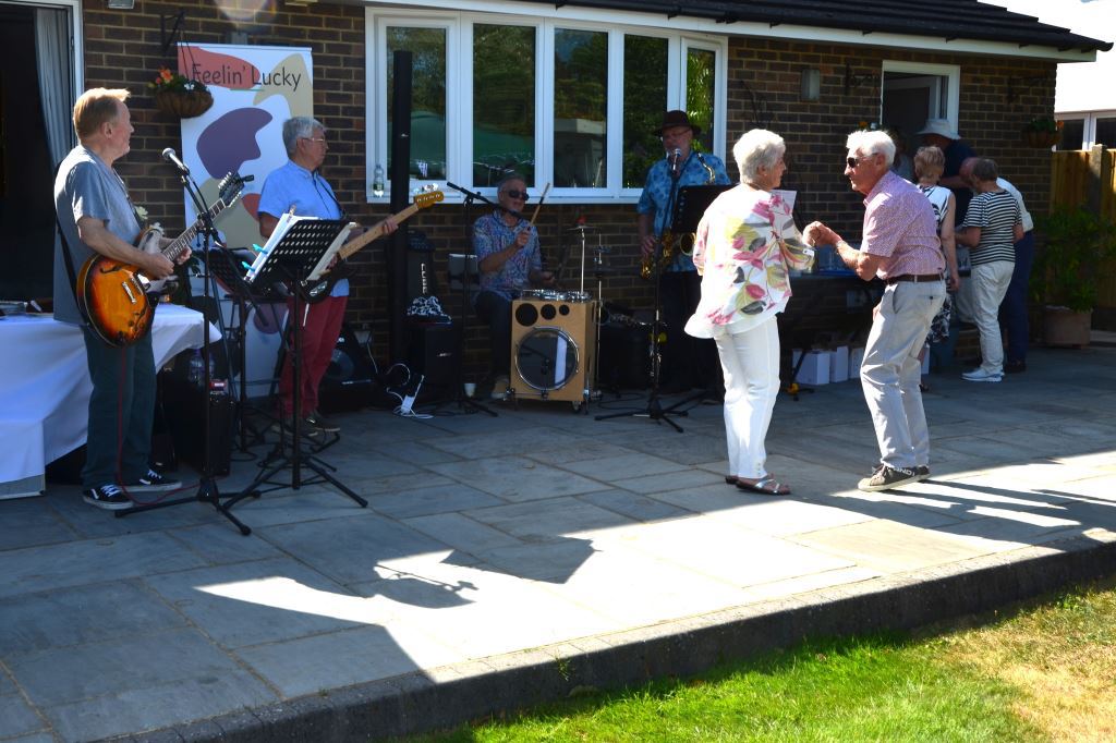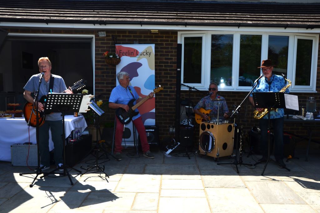 We were fortunate to avoid the rain and adjourned to the nearby Crown Inn for an excellent lunch and listen to the local group Feelin’ Lucky who entertained us with songs and music from our era whilst the rain came down outside!
